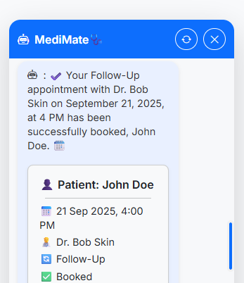 This is an advanced, agentic AI powered Appointment Assistant chatbot designed to intelligently manage the entire appointment lifecycle end-to-end — it can View upcoming appointments, Book new ones instantly, Modify or Reschedule existing bookings, and perform several additional context-aware appointment related tasks automatically. It can reason, decide actions on its own, analyze user intent, validate specialty and availability, handle conflicts, ensure correct routing, and continuously assist the patient step-by-step with a smooth, highly personalized, smart appointment experience — without the user needing to manually navigate complex scheduling workflows.