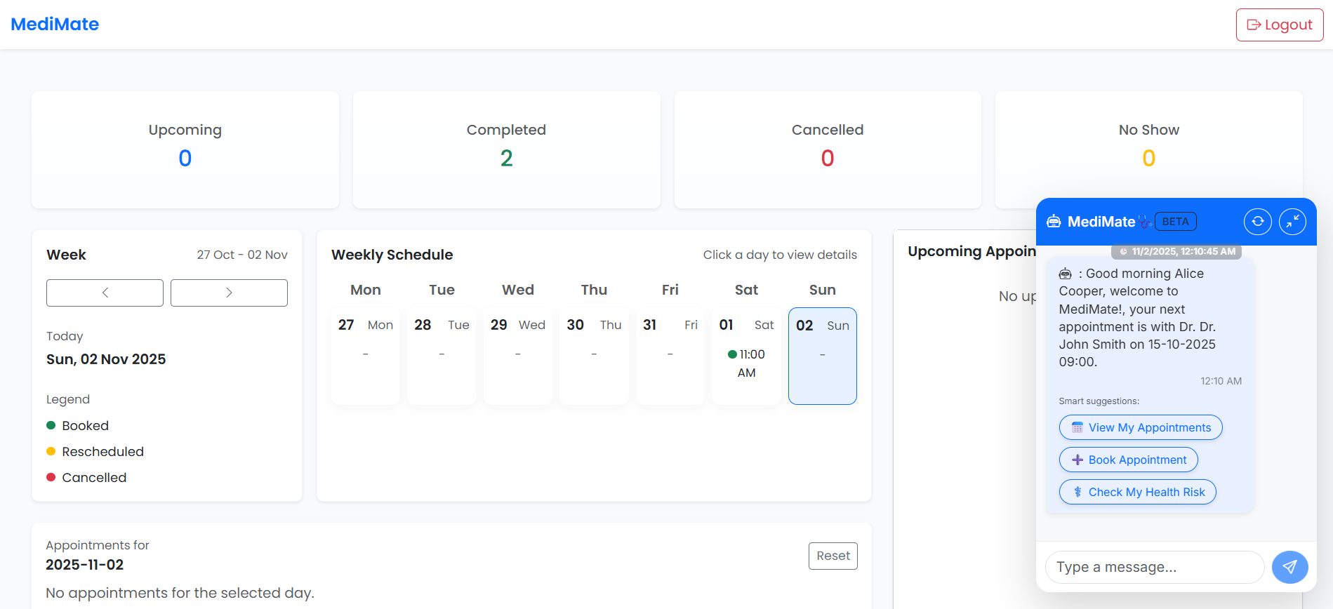 This is an advanced, agentic AI powered Appointment Assistant chatbot designed to intelligently manage the entire appointment lifecycle end-to-end — it can View upcoming appointments, Book new ones instantly, Modify or Reschedule existing bookings, and perform several additional context-aware appointment related tasks automatically. It can reason, decide actions on its own, analyze user intent, validate specialty and availability, handle conflicts, ensure correct routing, and continuously assist the patient step-by-step with a smooth, highly personalized, smart appointment experience — without the user needing to manually navigate complex scheduling workflows.